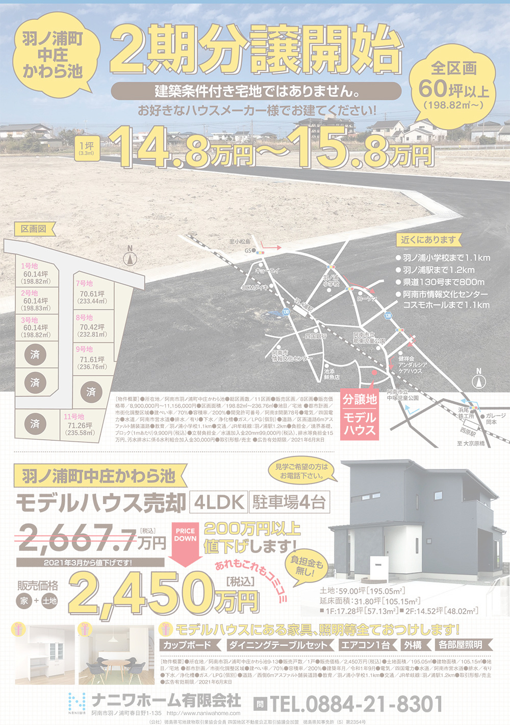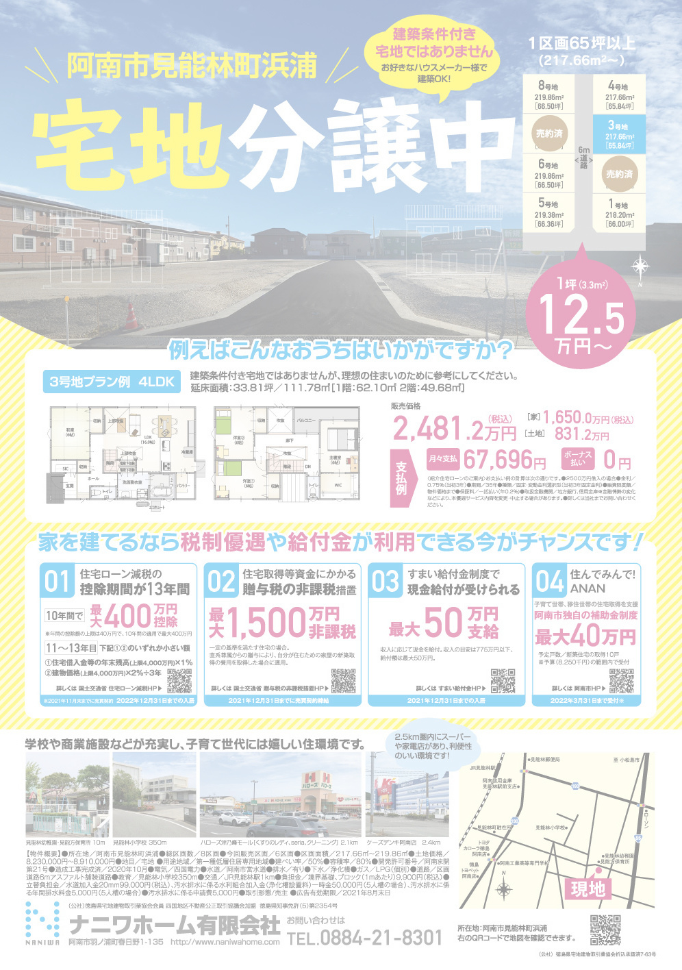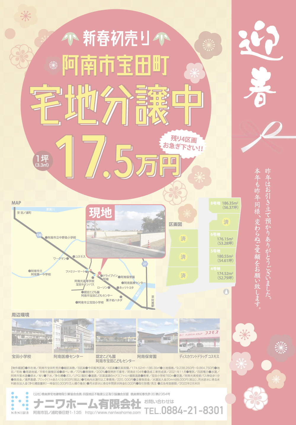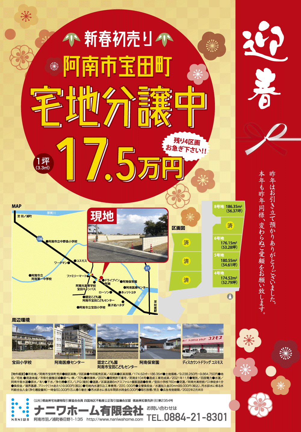 | 2023.12 | 阿南市宝田町今市で新規分譲地6区画の販売を開始しました。 |
